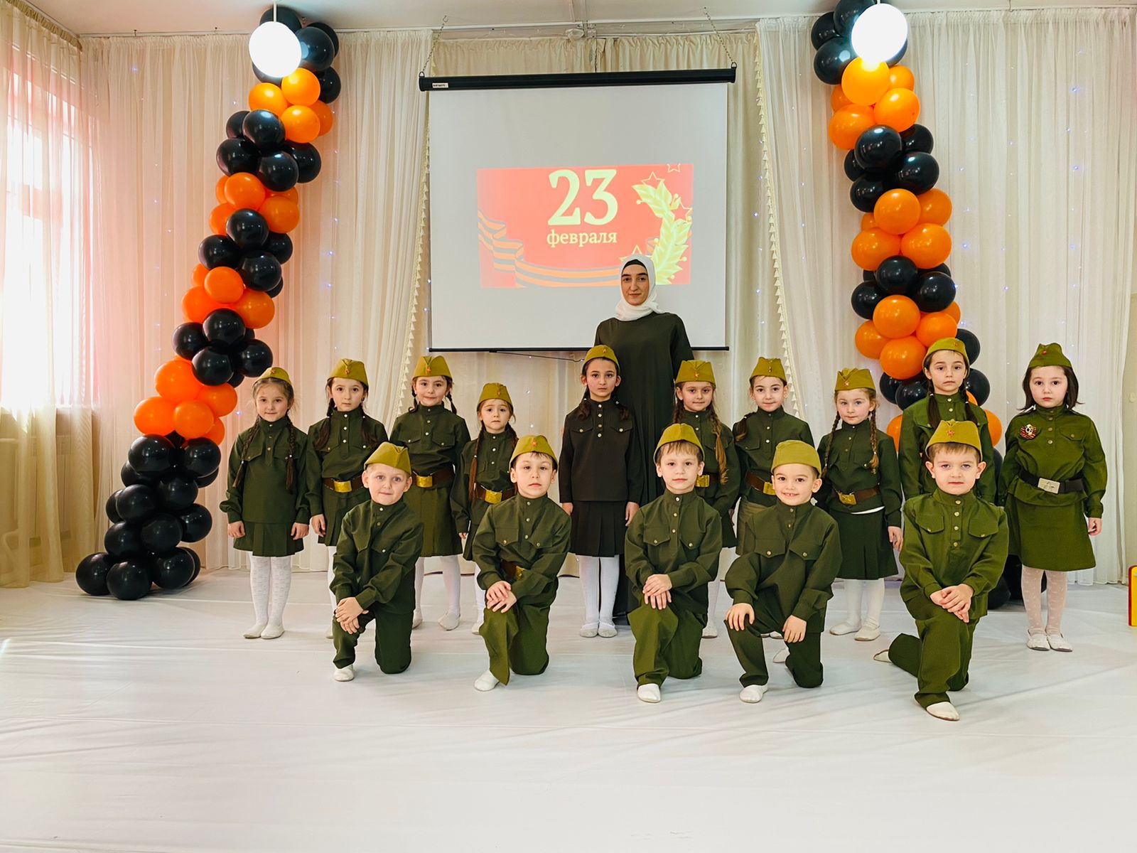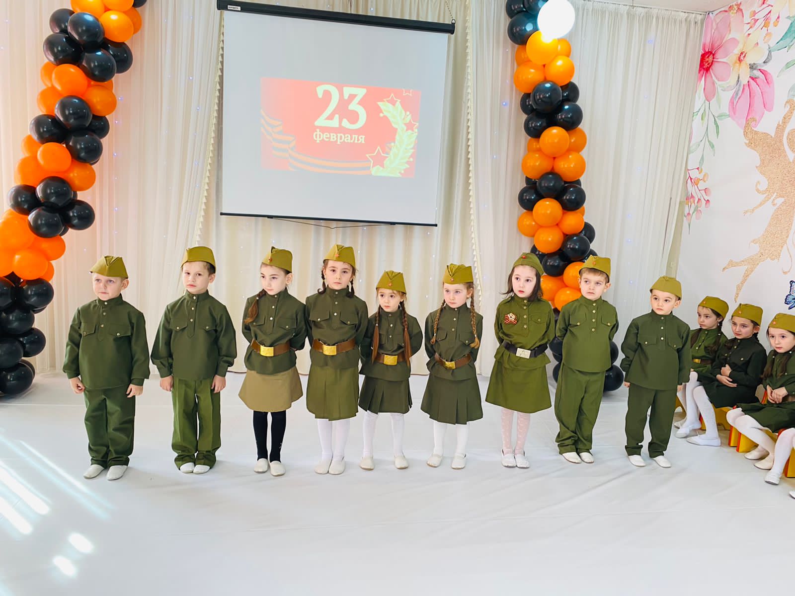 В старшей группе "Зайчата" было организовано мероприятие ко Дню Защитника Отечества, дети пели песни, рассказывали стихи и участвовали в играх.